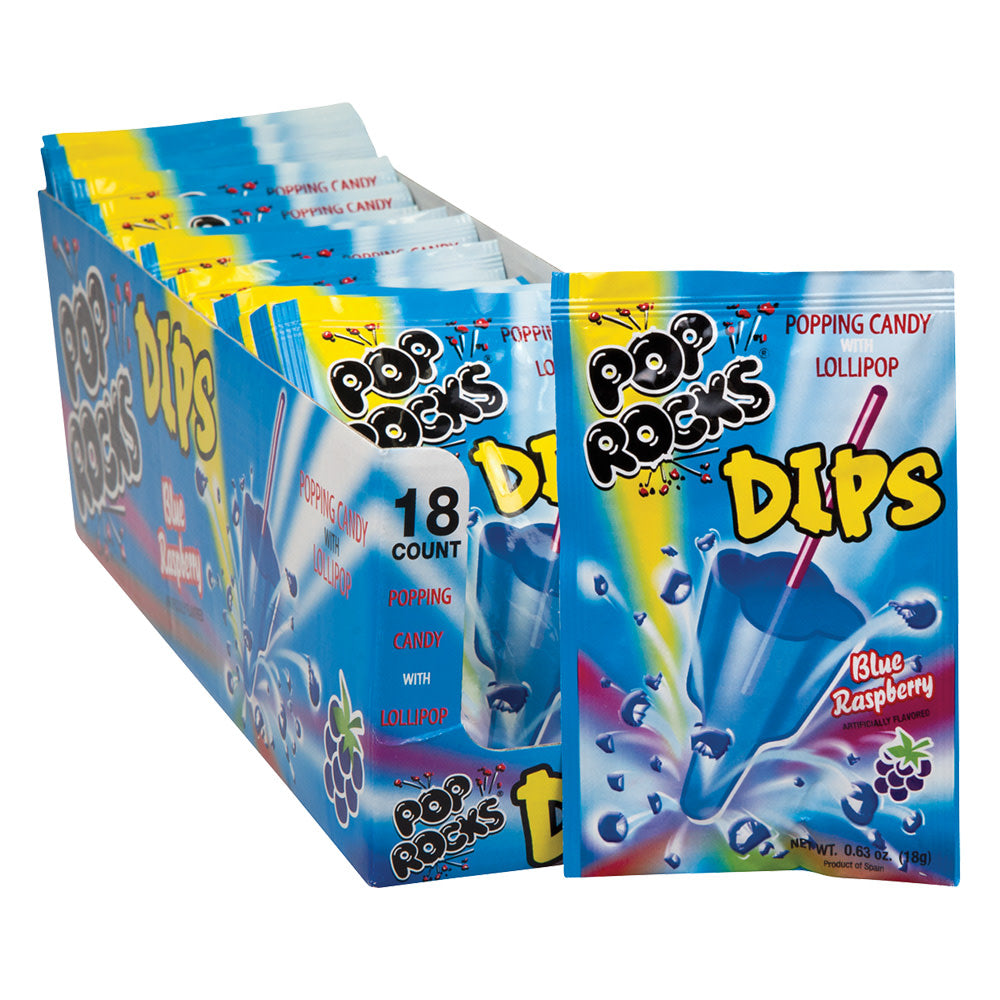 Pop Rocks Dips combines the classic crackling candy with a blue raspberry lollipop for double the fun. This 18-count display box gives you plenty of individual packets for retail or party distribution.